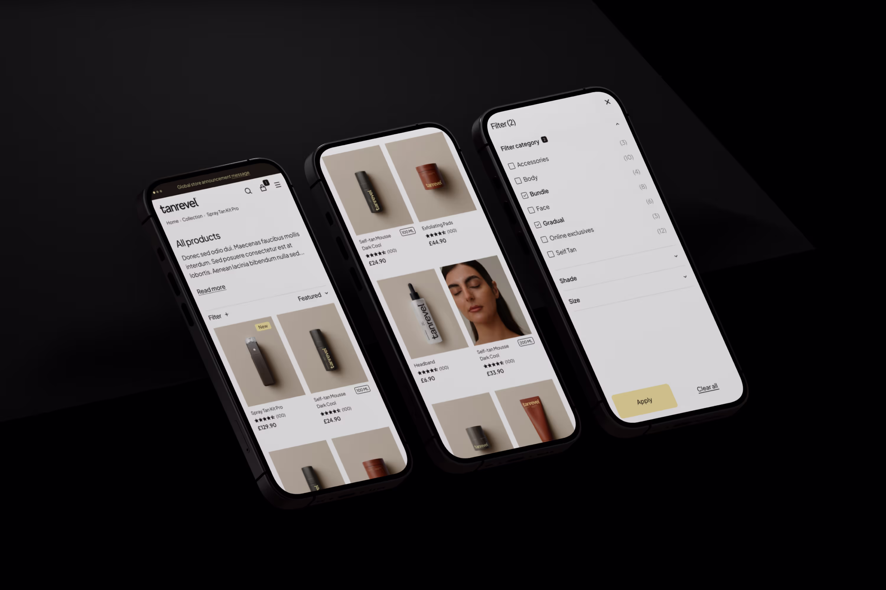 UI and UX design for self tan brand Tanrevel. On assignment for ecommerce agency Panagora. Designed and developed on Shopify.